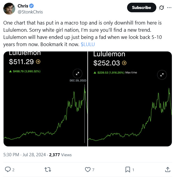 Before we get down to it, I need to give you the usual disclaimer. Remember, this is not financial advice. I’m not advising you or encouraging you to buy Lululemon. This is education and entertainment only. If you chose to copy me and lose money, that’s on you, not me.