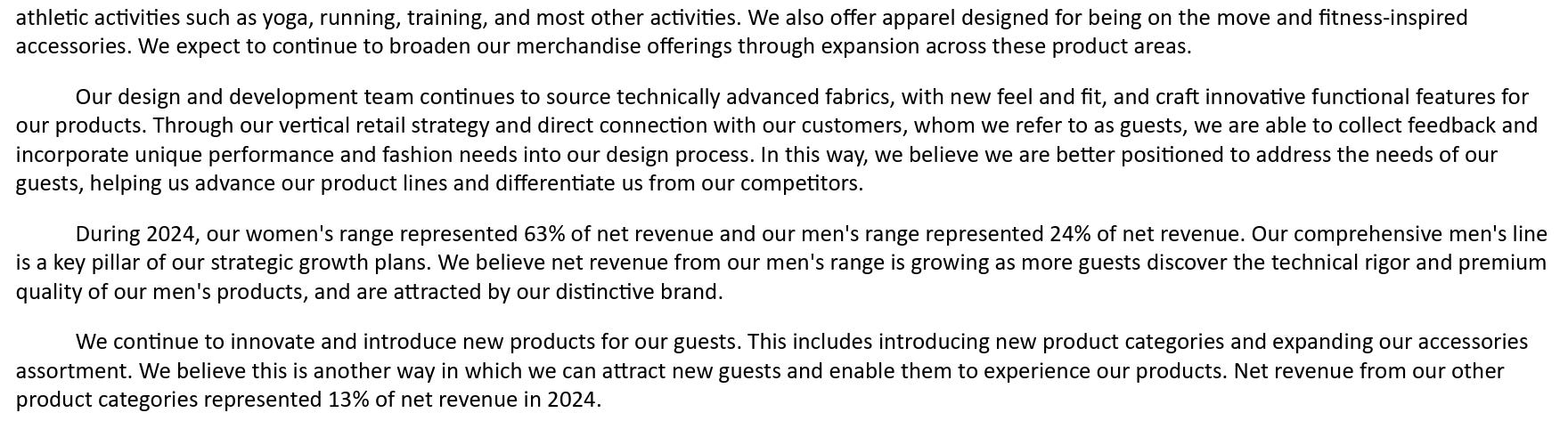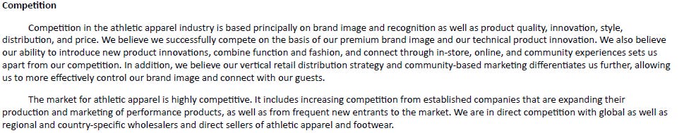 Lululemon should have high quality data on it’s customers given it primarily does direct to consumer (DTC) sales. It means they can collect more data on consumers and determine what they want earlier than a competitor that uses third party franchises and wholesale partners who won’t share that data readily with Lululemon. This informs branding, marketing and new designs.